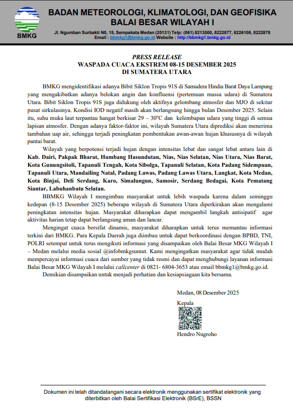 PRESS RELEASE WASPADA CUACA EKSTREM 08-15 DESEMBER 2025 DI SUMATERA UTARA
