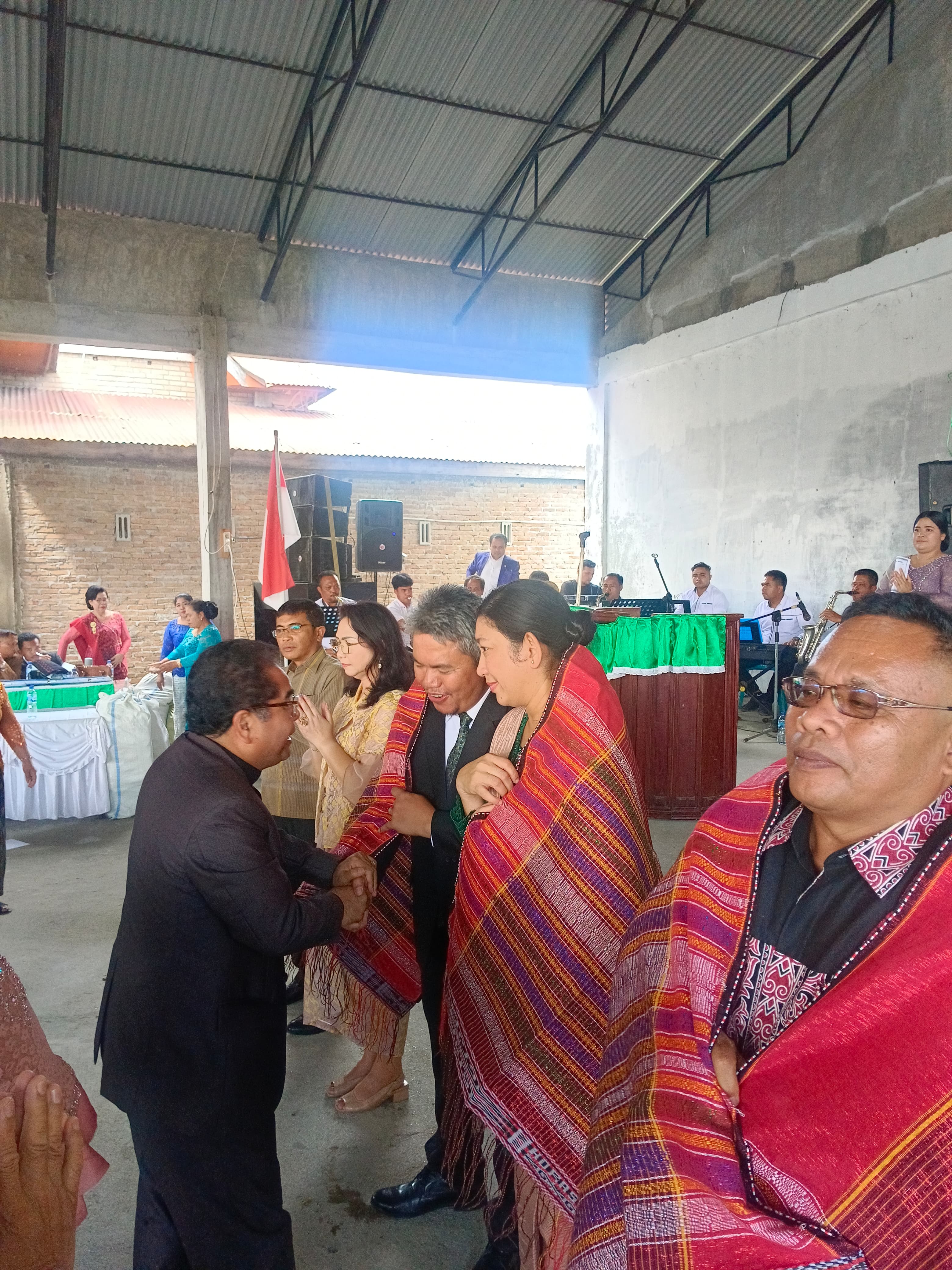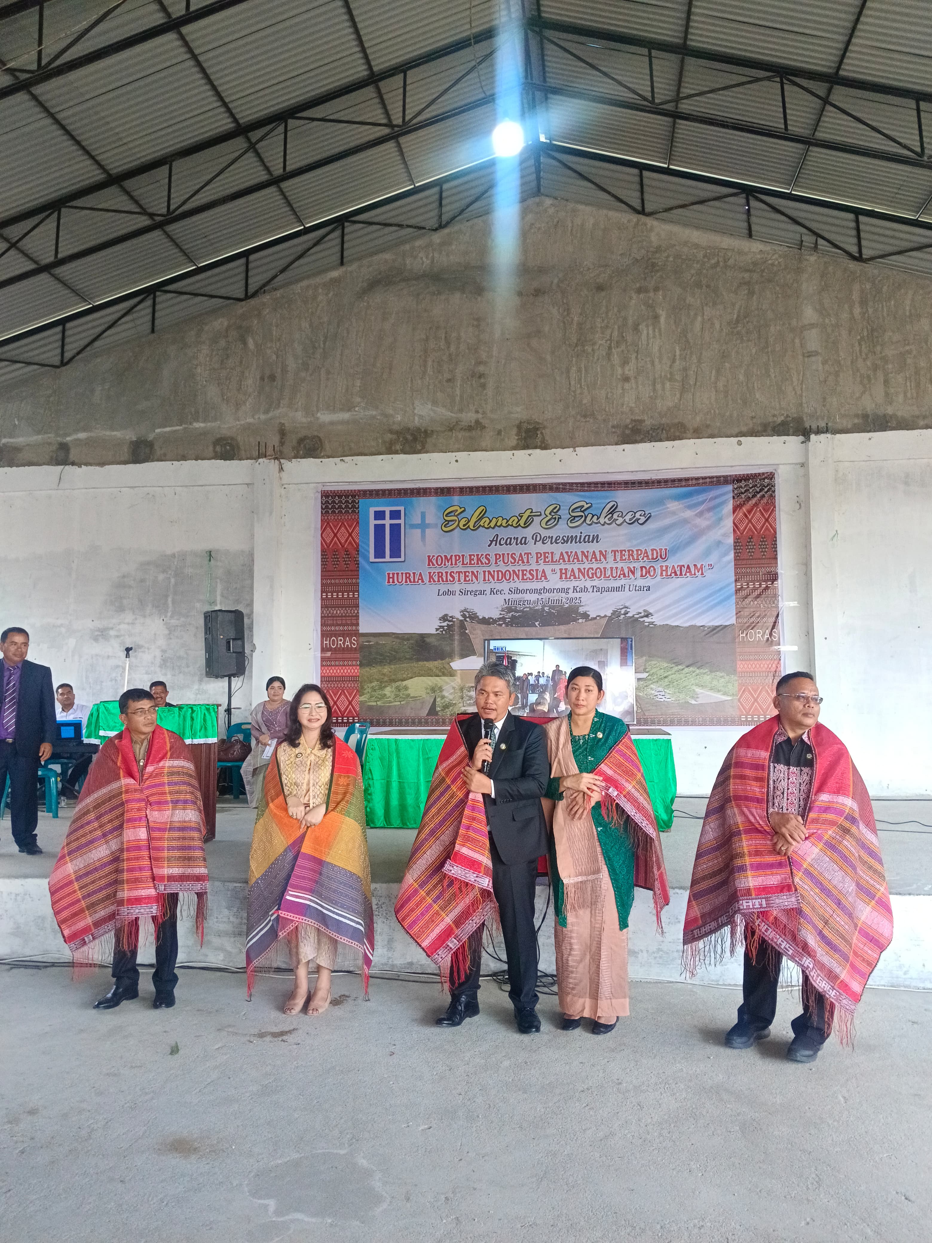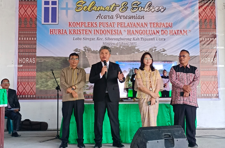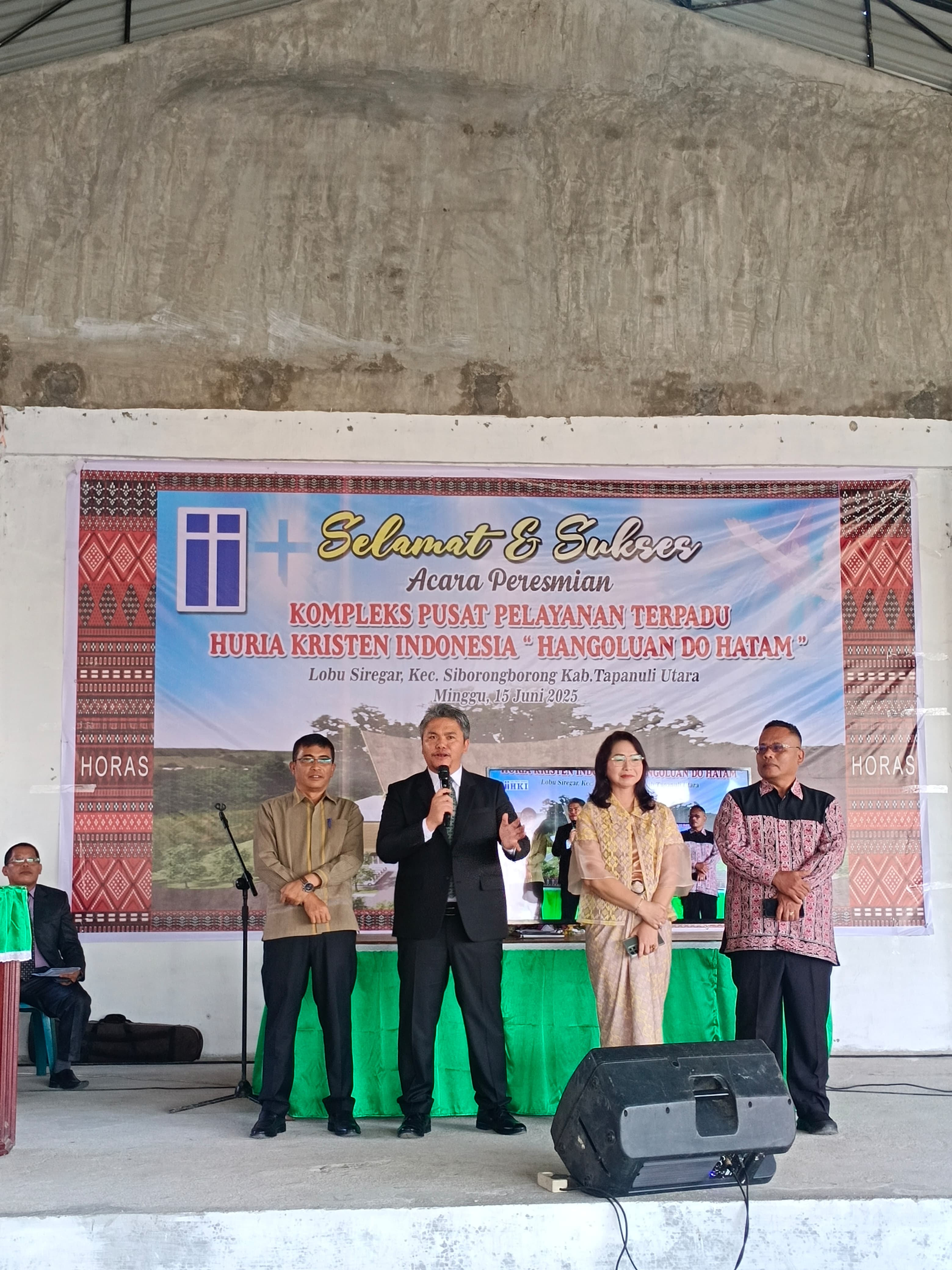 Wakil Bupati Tapanuli Utara, Dr. Deni Lumbantoruan, M.Eng, bersama istri Ny. Lisa Deni Lumbantoruan br. Malau, menghadiri acara peresmian Kompleks Pusat Pelayanan Terpadu HKI “Hangoluan do HataM” yang dialihkan pelaksanaannya ke Gereja HKI Hutasoit Pardomuan (HChB), Desa Siborongborong, Minggu, (15 Juni 2025).
